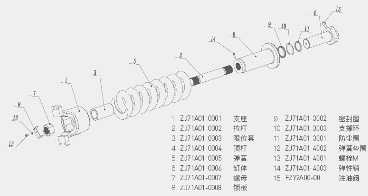 產(chǎn)品簡介:張緊裝置適用于挖掘機、起重機、旋挖機、平地機等全液壓履帶式行走機械,主要功能是實現(xiàn)對履帶的張緊功能。